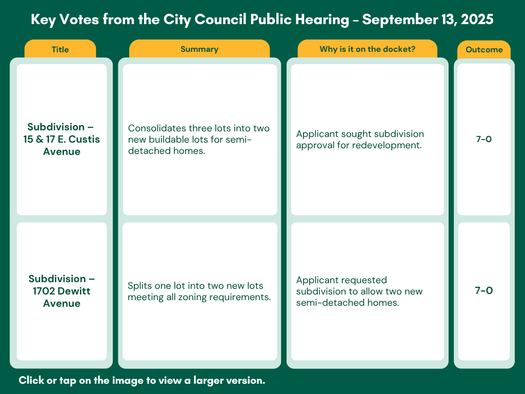 - Approved a subdivision ordinance to split one lot into two at 1702 Dewitt Avenue in compliance with zoning and subdivision requirements.