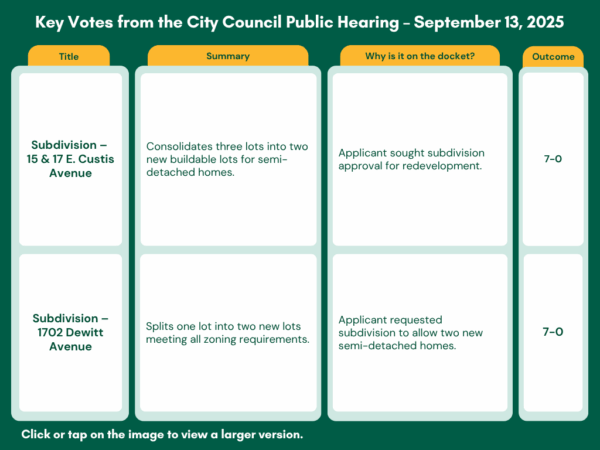- Approved a subdivision ordinance to consolidate three lots into two at 15 & 17 E. Custis Avenue (with demolition prior to new construction or sale).