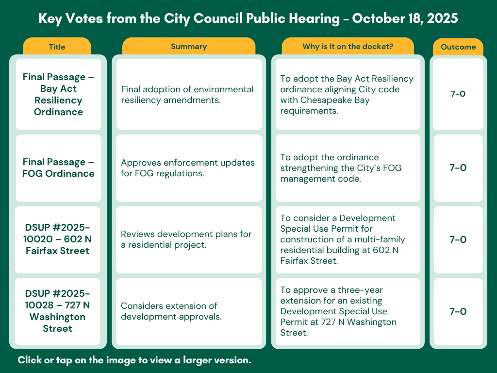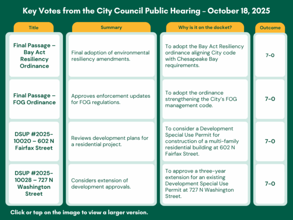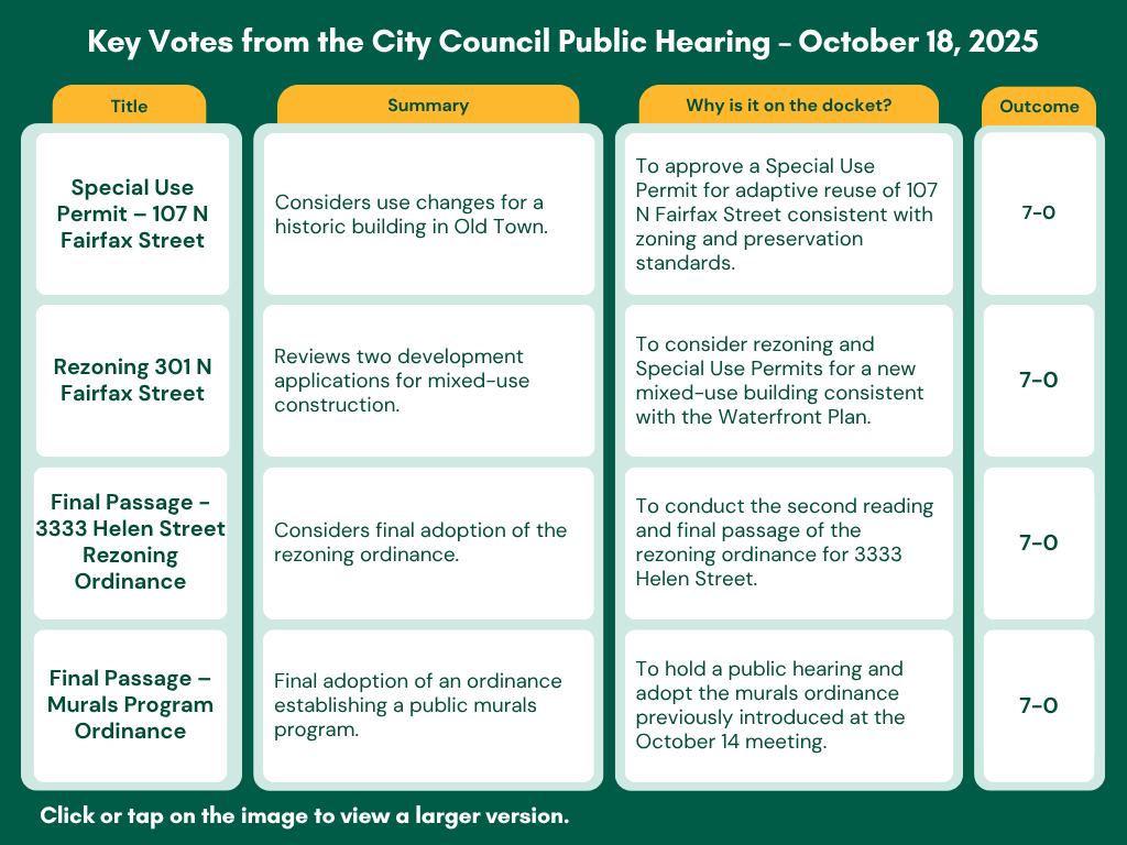 - Approved rezoning and special use permits for 601 Wythe Street to convert an office building into residential units.
