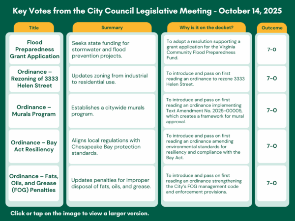 - Introduced ordinances for mural program, coastal resilience updates, and FOG penalties to be finalized at the next Public Hearing.