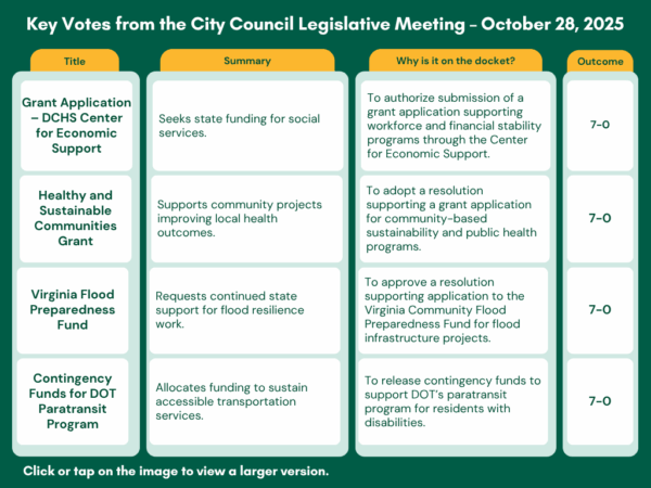 - Approved a Virginia Flood Preparedness Fund grant for stormwater and flood mitigation projects at Four Mile Run and Hooffs Run.